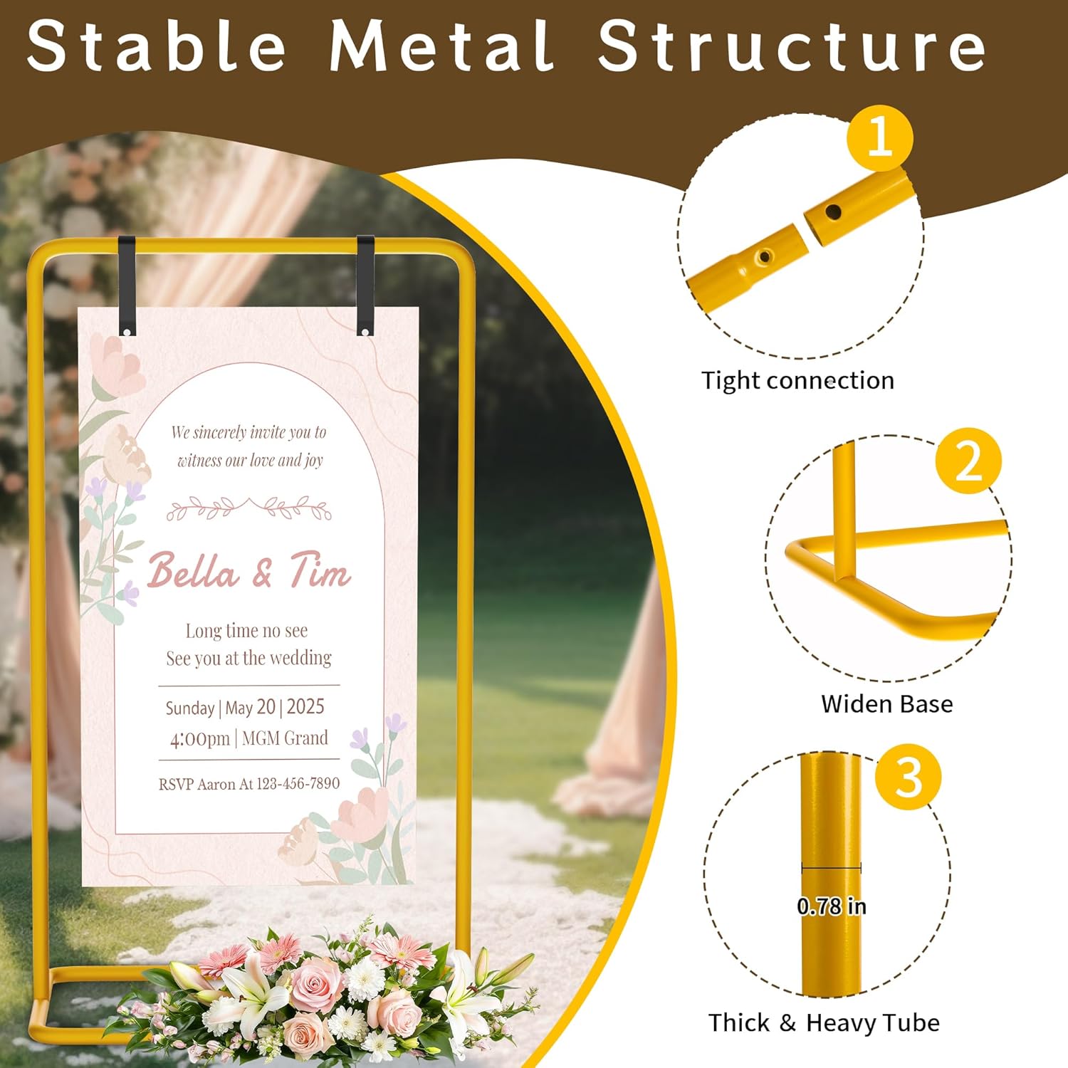 Premium Wedding Sign Holder, Adjustable Iron Easel with Rust-Proof Coating​High-grade iron frame with rust-proof coating resists weather and retains elegance. Adjustable up to 31.5''L x 68.5''H x 19.49''W, weighted base ensures stability, supporting up to 35 lbs. Matte opulent rose gold finish fits all wedding themes.​Specifications:​Material: High-Grade Iron (Rust-Proof Coating) + Weighted Base​Weight Capacity: 35 lbs​Adjustable Dimensions: Up to 31.5''L x 68.5''H x 19.49''W​Finish: Matte Rose Gold​Accessories: 6 ribbon rolls (24M/each), 2 faux leather straps, 1 cloth bag, 5ft artificial greenery​Key Features:​Sleek Elegance: Clean lines, minimalist design—signage stays focal, matches rustic/boho/glam decor.​Versatile Display: Mix included accessories to customize for weddings, baby showers, corporate events.​Sturdy & Durable: Reinforced frame + rust-proof coating, fits indoor/outdoor use.​Tool-Free Assembly: Set up in minutes with step-by-step guide.​Multi-Use: Holds posters, acrylic signs, chalkboards—ideal for welcome signs, seating charts, trade shows.