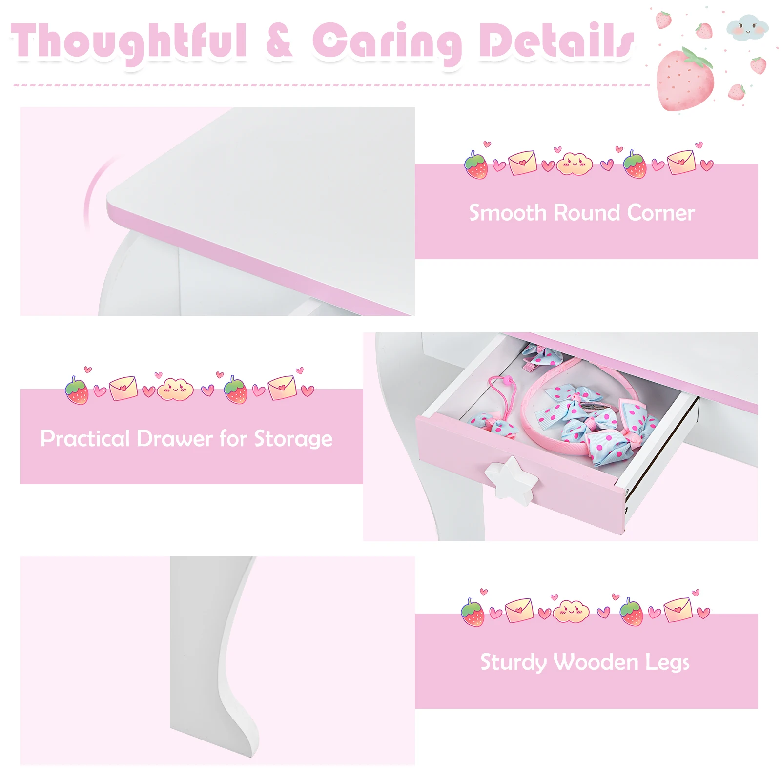 With the clear mirror, this kids vanity table and stool set with cute patterns is a fun and functional addition to your child's bedroom or play area. And you can remove the top if your kids need to concentrate on drawing or writing. After finishing make up or study, there is a practical drawer which comes with ample space to store items to keep the tabletop tidy and clean. Considering your kids' safety, this high quality vanity set is equipped with round edge design and anti-toppling device. In order to give this perfect present to your little princess quickly, the instruction will help you to assemble it. And the smooth surface can be cleaned with damp cloth for great convenience.